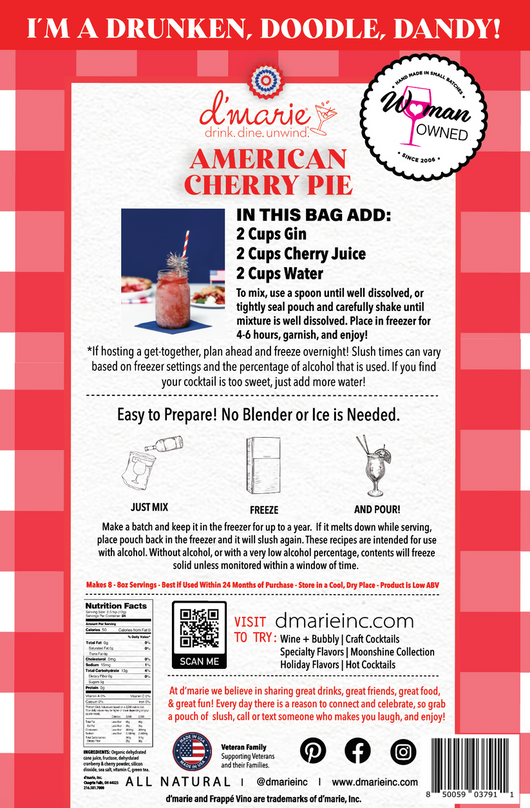 Each Pouch makes eight - 8 oz. glasses and calls for 2 Cups Gin, 2 Cups Cherry Juice, 2 Cups Water