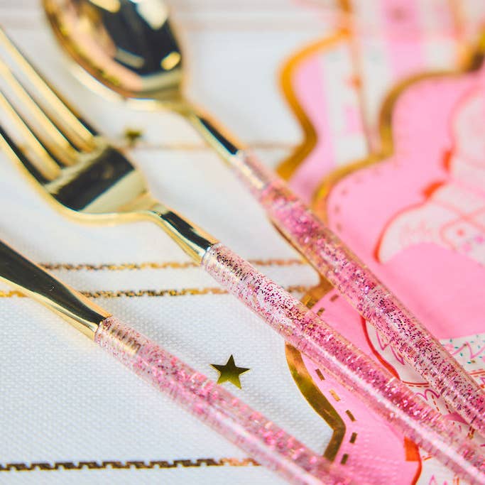 Ditch the boring cutlery - this disposable utensil set brings the sparkle! Featuring a gold-toned knife, fork, and spoon with glittery pink handles, this trio adds instant glam to any table setting.