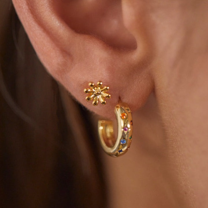 Brighten up your outfit with these gold plated Rainbow Celestial Hoops. Featuring a small, thick hoop earring with multi-coloured gems, these hoops embody fun, playfulness and joy!