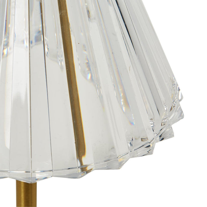 With an elegant clear acrylic shade and gold base, this LED lamp provides cordless light at the touch of a button. Once charged via the included USB cable, the lamp can be used anywhere and includes three light settings and a dimmer function.