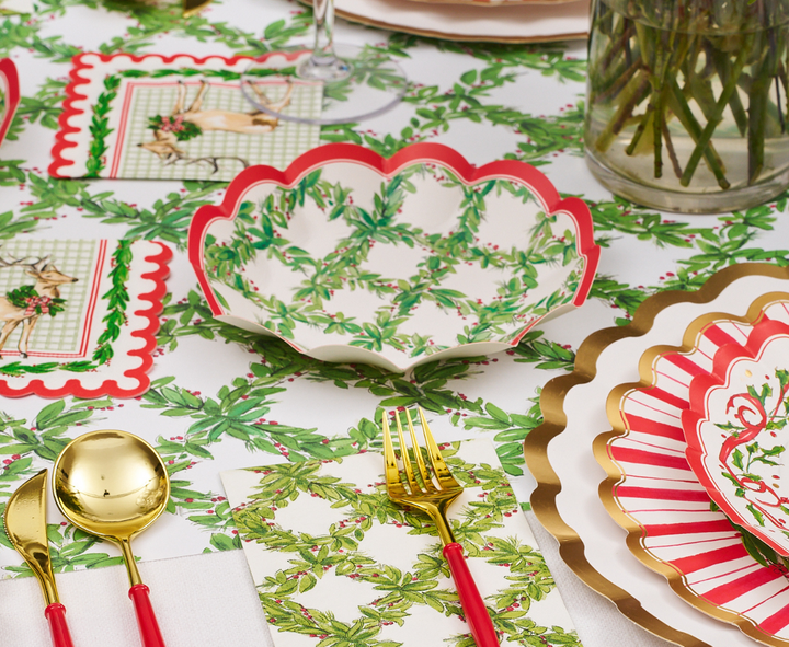 These scalloped edge appetizer bowls from the Holly Berry collection feature a festive trellis of lush Christmas greenery and bright holly berries. Finished with an adorable scalloped red edge, they add the perfect touch of charm to your holiday celebrations. These bowls are both durable and disposable, allowing you to skip the dirty dishes, without sacrificing quality and style. Your guests will never believe they’re disposable!