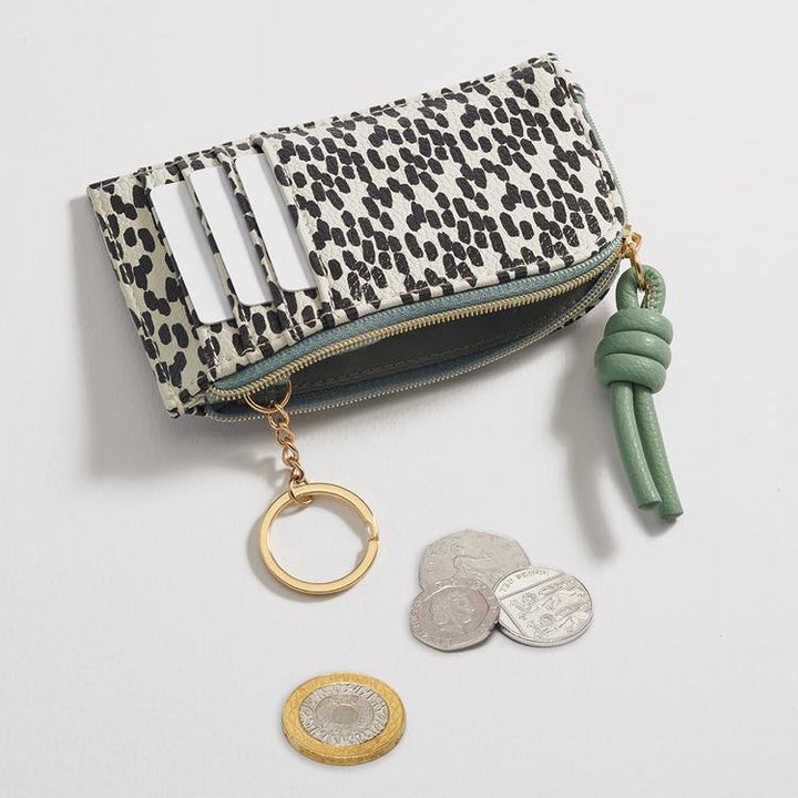 Our Knot Card Purse in spot print is a sleek, modern design with a chunky knotted zip. Secure this pouch onto your keychain, belt loop, or bag to keep your cards and cash handy.