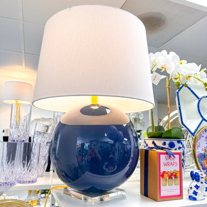 Indigo lamp with brass hardware. Artfully aesthetic. Handmade to order, this artisan lamp features a shiny gloss finish and circular body. An acrylic base and finial complete the contemporary look.
