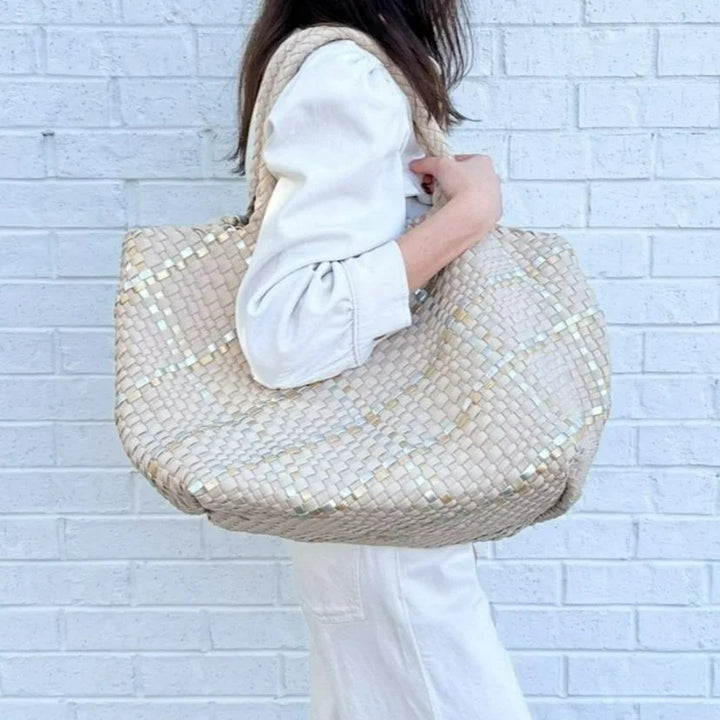 A fresh take on everyday style—lightweight, versatile, and ready for anything! This large tote is crafted from a handwoven neoprene blend for a modern, effortless look. Its washable and durable design makes it a perfect on the go tote, from the gym to your favorite destination spot!