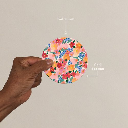 Set of 4 coasters featuring hot foil stamped designs, which are corked-backed and heat + water resistant