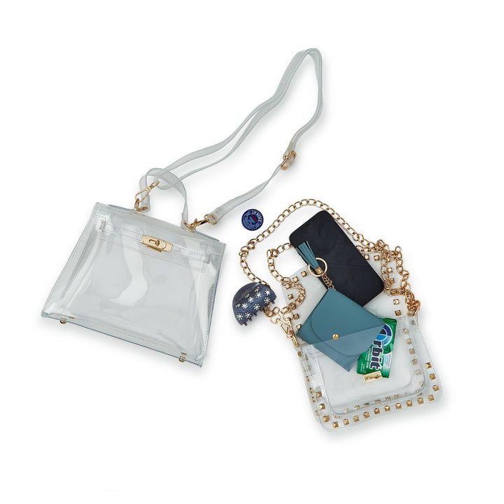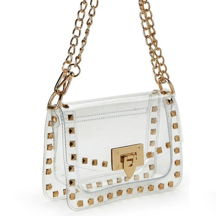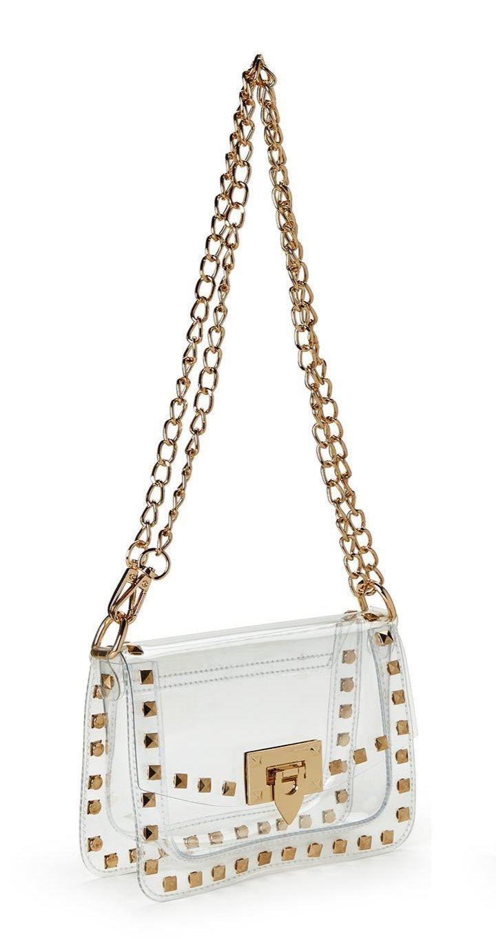 Don't let the clear bag rule cramp your style! This studded crossbody is the perfect stylish, stadium-approved clear bag for your next sporting event or concert.