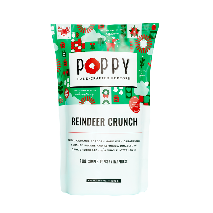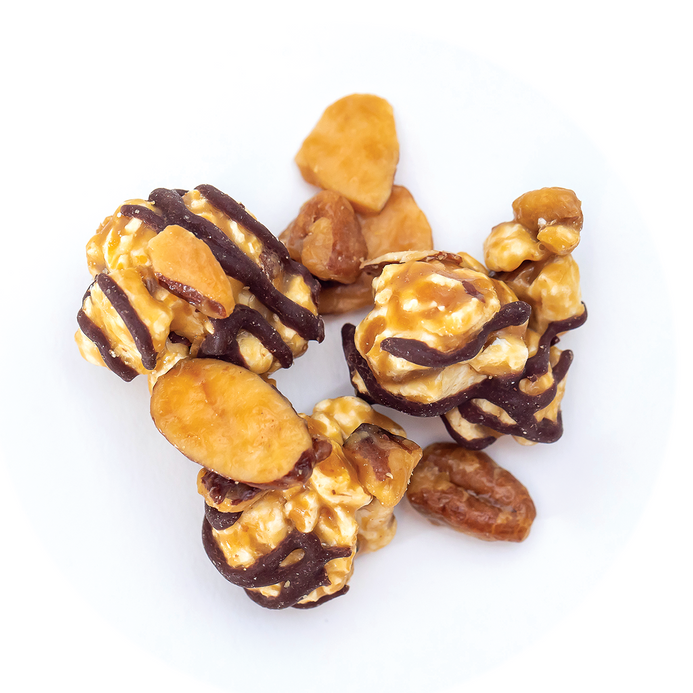 Sleigh With This Sweet Treat A mix of Poppy's famous Salted Caramel popcorn with caramelized walnuts, pecans and cashews, all drizzled with French Broad Chocolate™ craft dark chocolate.