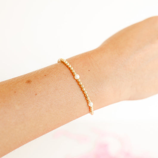 Material: 14 K gold filled beads, pearls and durable elastic string so perfect for everyday wear! Sweat proof, water proof and tarnish free!