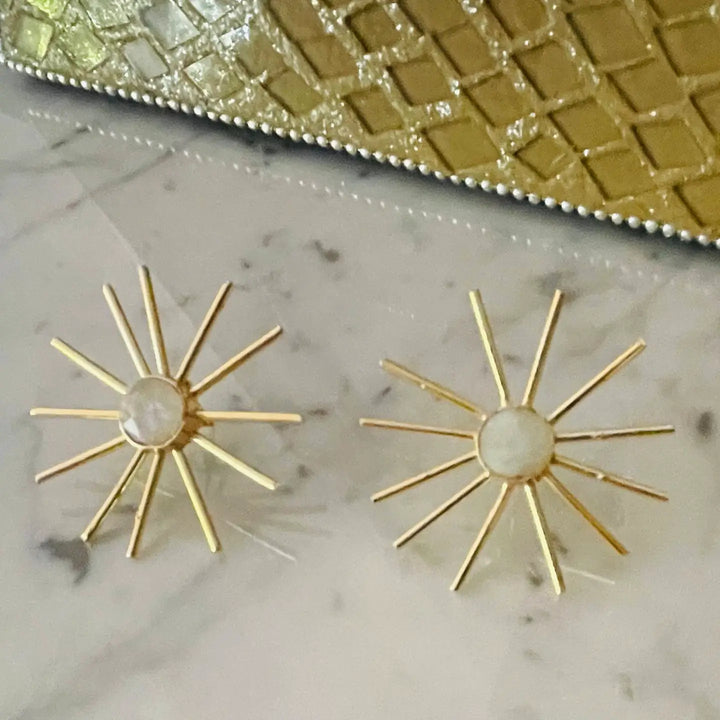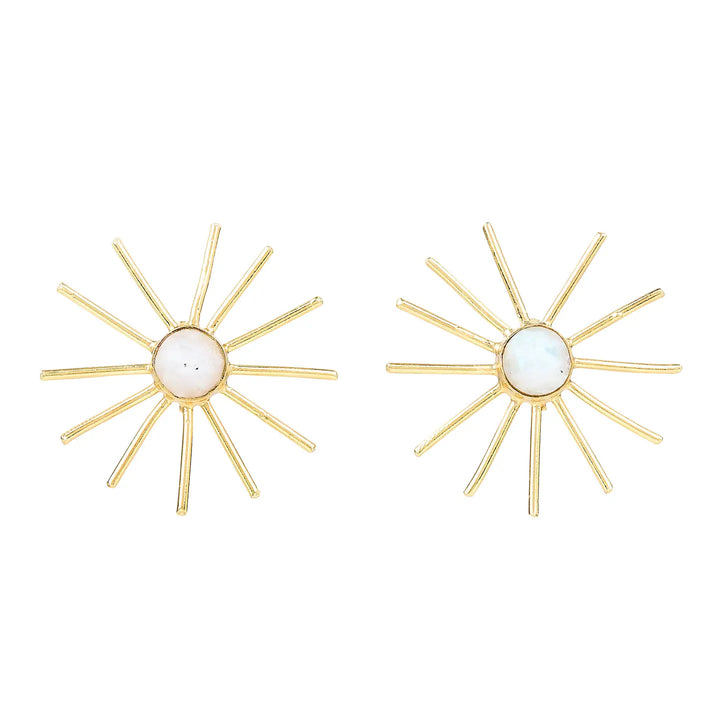 Illuminate your look with the Moonstone Statement Sun Studs. These striking earrings feature a sunburst design adorned with radiant moonstone accents. Each stud showcases a central moonstone, known for its soft, ethereal glow, surrounded by intricate sunburst detailing that amplifies its luminous charm.