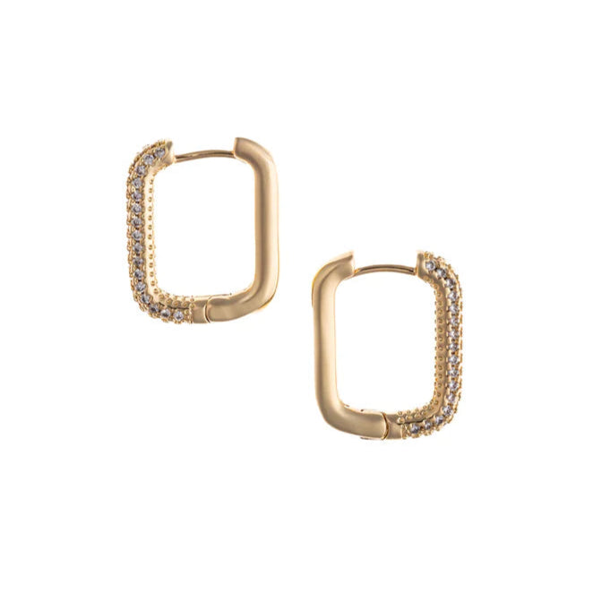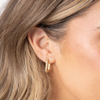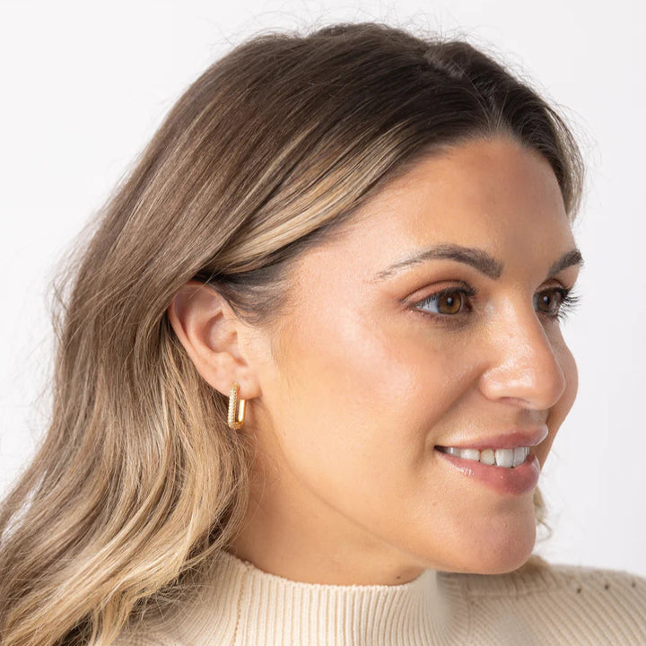 These stylish earrings beautifully combine the classic huggie design with a sleek hoop silhouette, creating a versatile piece that can be worn every day or for a special occasion. Crafted with delicate gold detailing and stunning glass tones, they offer a modern twist on timeless elegance.