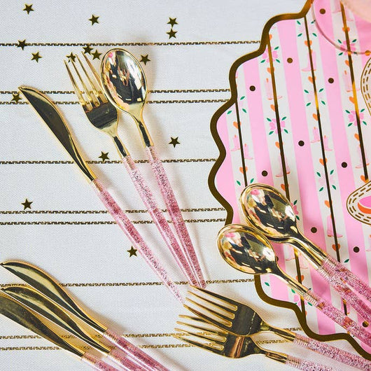 Ditch the boring cutlery - this disposable utensil set brings the sparkle! Featuring a gold-toned knife, fork, and spoon with glittery pink handles, this trio adds instant glam to any table setting.