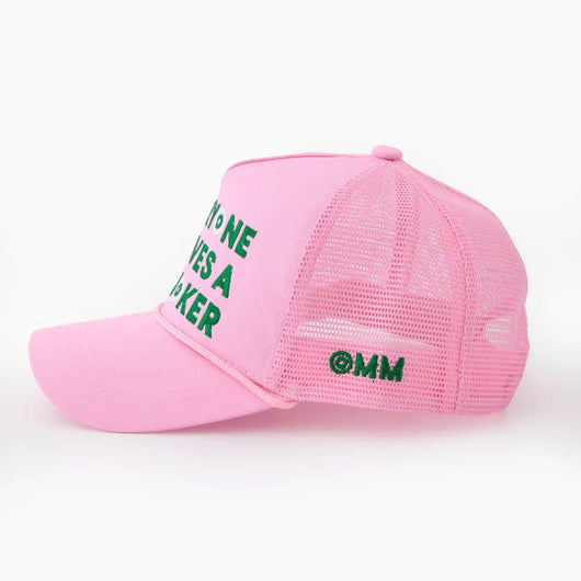 Play your hand in style with the Everyone Loves a Joker Trucker Hat! This light pink foam trucker hat is as cheeky as it is cute, featuring "Everyone Loves a Joker" embroidered in teal and white for a playful touch. The breathable mesh backing, embroidered with OMM, keeps you cool whether you're winning at the table or just out and about.