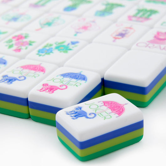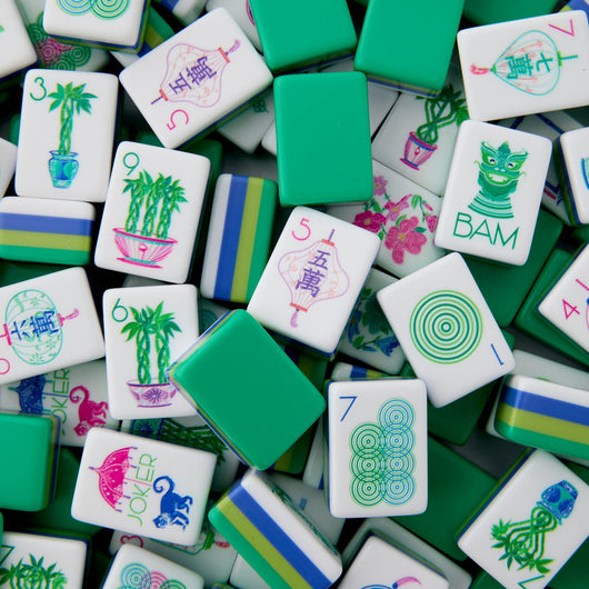 Inspired by the beauty of the great outdoors, the Jasmine Tiles bring a refreshing and vibrant touch to your mahjong game. Featuring a harmonious blend of kelly green, muted lime, and deep blue, this nature-inspired colorway captures the essence of lush gardens, rolling meadows, and tranquil waters. Whether you're playing under twinkling patio lights or gathered around the table with friends, the Jasmine Tiles infuse every game with a breath of fresh air and timeless elegance!