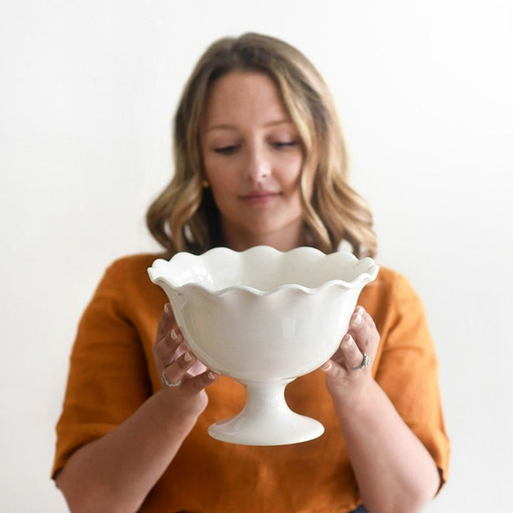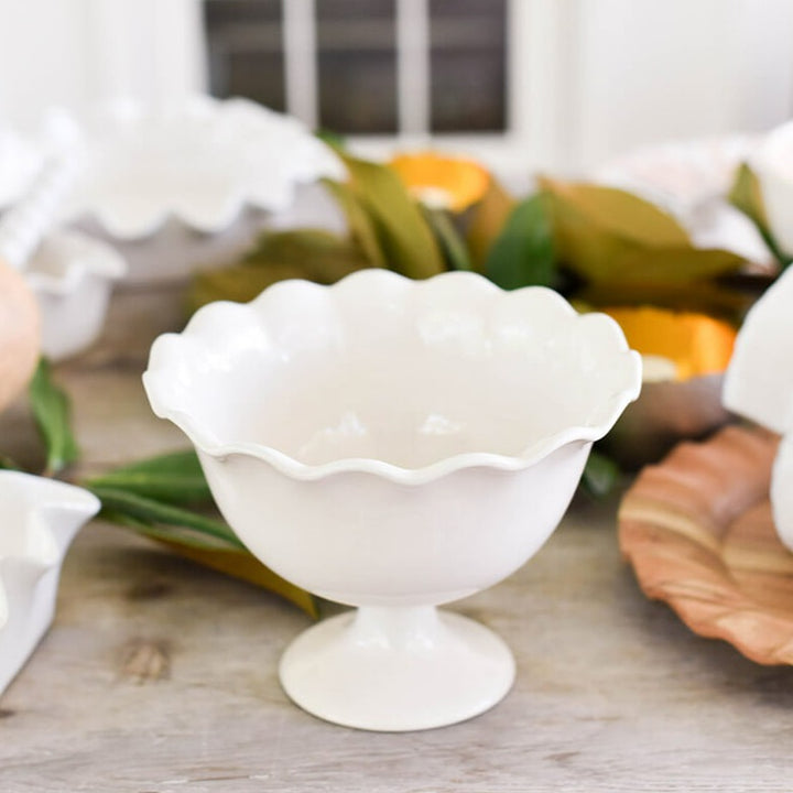 From a registry staple to everyday dining, the Signature White Ruffle Trifle Bowl is a must have for any home! This adorable footed bowl features hand-painted brushstrokes, ruffled edge, and versatile style that goes from the oven to the table with ease.