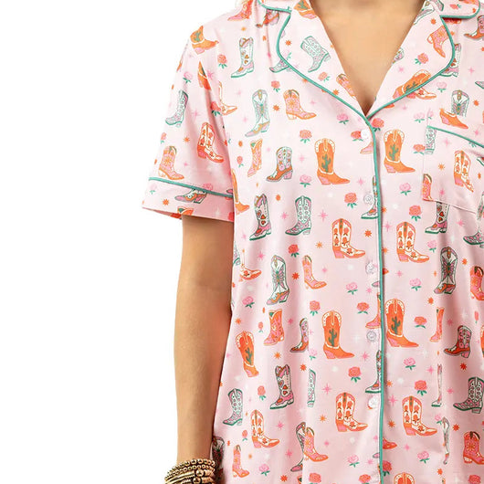 Saddle up, y’all — the Boots & Roses Pajama Set is here to bring a little Southern charm to your nightime routine! This western girly pajamas set combines soft comfort with bold cowgirl energy, featuring a pink backdrop covered in colorful cowboy boots, blooming roses, and tiny stars. Soft, sweet, and a little sassy, the Boots & Roses Pajama Set is where Western roots meet girly dreams - made to make every night feel like a rodeo after-party!